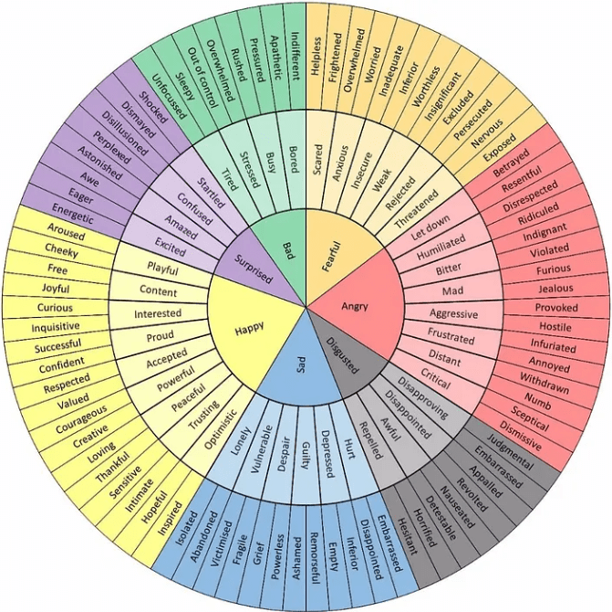 Continue your emotions journal this week. Use this emotion wheel to identify the root of the emotion you felt and why.